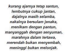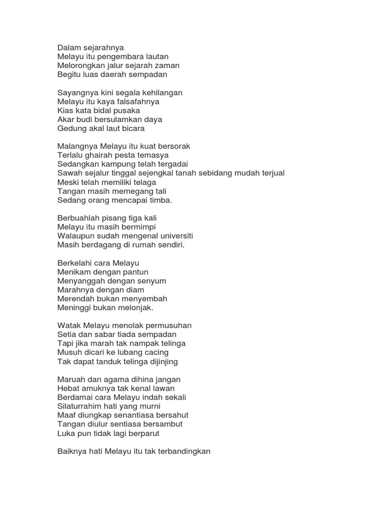 Melayu itu berani jika bersalah. Kecut takut kerana benar Janji simpan di perut. Melayu itu orang yang bijaksana.